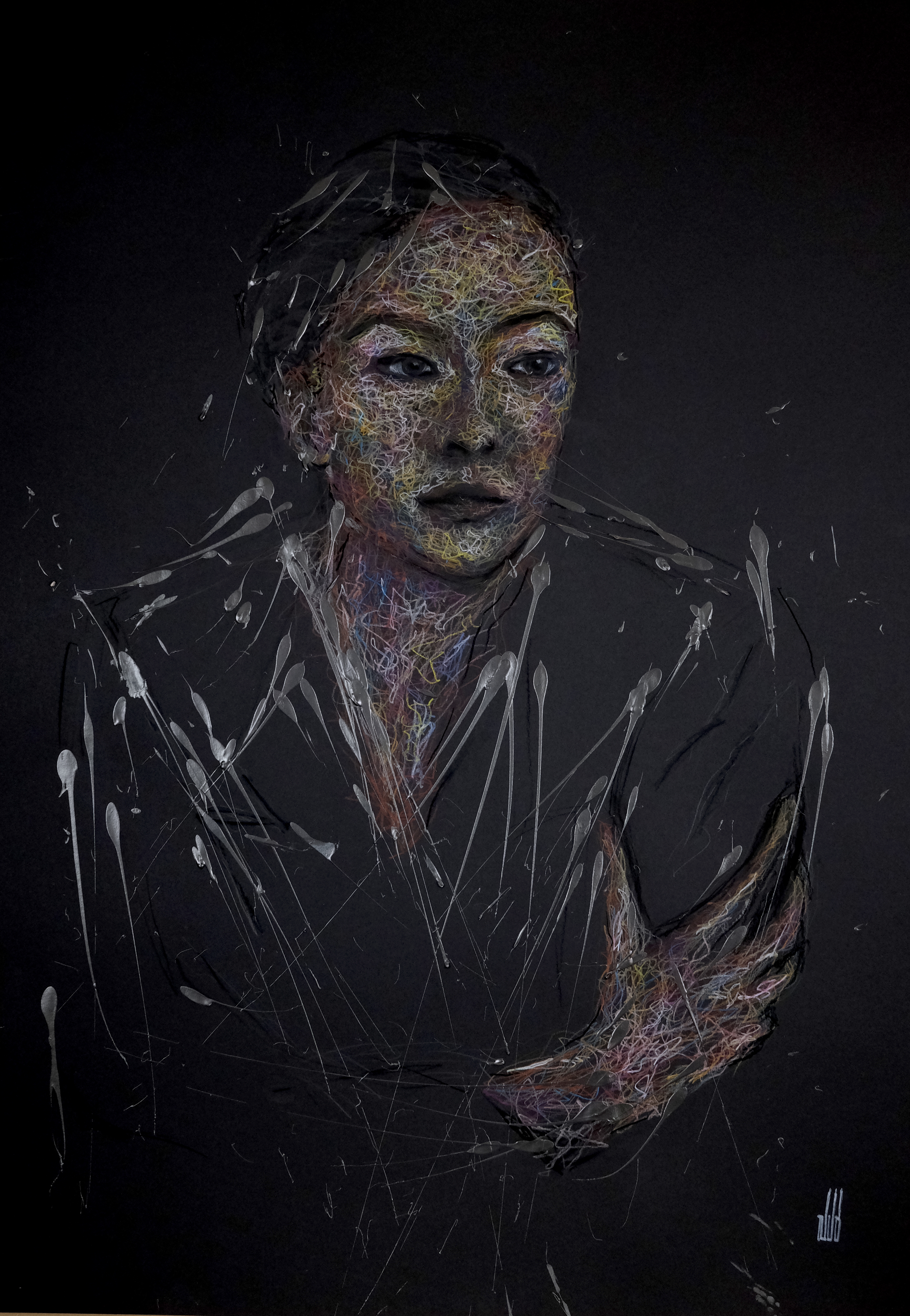-Woman in black- Drawing black paper & pencil 70 x 100 cm In life, as in art, the character, beauty and passion emerge from the curves and squiggly line and grows into uniqueness as time goes by.
